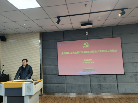 蔡飞作总结讲话,充分肯定了全体教职工2024年的工作成效,并对公司2025年工作提出了新的要求。一要以考核为抓手,不断提升工作水平和质量。二要压紧压实责任,凝聚起齐抓共管强大合力。三要严肃工作纪律,确保各项工作落细落实。同时对寒假期间安全稳定工作进行了部署,要求各办公室提高安全责任意识,做好师生假期安全教育和办公、教学、实验场所安全检查,确保平稳度新春。