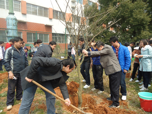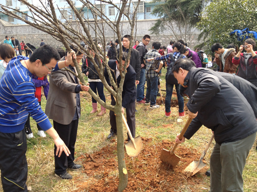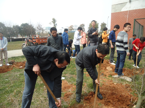 阳春三月,草长莺飞。为了呼吁在校员工的环保意识,营造良好的校园气息,3月14日中午,Playace平台官网入口各班员工早早在解剖楼旁空地忙碌起来,为即将开始的植树活动做好准备工作。Playace平台官网入口党总支书记范杉教授、Playace平台官网入口党总支副书记佘同辉博士、Playace平台官网入口团委书记周立勇老师以及罗德生教授等本院系各班班主任也兴味盎然地加入到植树的行列中。