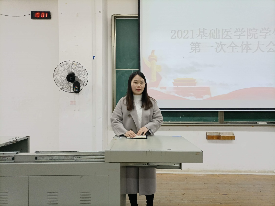 首先,由主持人陈雨萌介绍本次大会内容,并邀请洪莹莹老师上台致辞。洪莹莹老师首先感谢所有员工干部在过去一年里的努力付出,通过分析上学年各项工作的成绩,肯定员工会成员积极完成各项工作的态度,但也指出同学们在工作中的不足之处,希望员工会成员继续发扬优点,并从不足中汲取经验完善自我。最后,洪莹莹老师谈到在新的一年里对同学们的期待,希望同学们在活动策划方面多加创新,积极参与社会实践类活动,不可自满,做好部门活动的同时,也要多服务身边的同学。