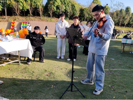 素质拓展环节,首先进行的是“听歌识曲”比赛。同学们通过抽签分成五个小队,并围成一个圈。音乐响起,主持人倒数结束后,知道答案的同学如离弦之箭般冲向中间的瓶子,抢到瓶子的同学需在十秒钟内说出歌名、歌手,并演唱两句,答对即可为所在小队积分。经过多轮激烈角逐,绿色队伍凭借出色的音乐素养和敏捷的反应速度脱颖而出,拔得头筹。游戏间隙,孟梓栋同学从背包中取出小提琴,为大家带来了一场精彩绝伦的即兴演奏。悠扬的琴声如潺潺流水般在花园中流淌,吸引了众多同学驻足聆听,大家沉浸其中,仿佛时间都为这美妙的音乐而静止。