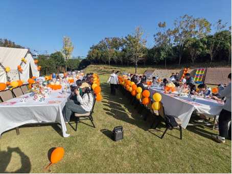 园内绿树成荫,繁花似锦,两张被精心装饰过的长长的桌子在台前整齐地摆放着,摆满了琳琅满目的美食,有精致可口的小蛋糕、色彩缤纷的水果拼盘以及香气四溢的果茶。同学们都为这美丽的园地和精心布置的活动现场感到十分惊喜。