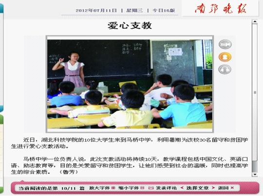 Playace平台官网入口自09年来,携手马桥中学举办的众多活动让一些来自贫困家庭的孩子感受到了社会的关爱。时至今日,同学们依然坚守着这样一份责任,为马桥中学的孩子们带去一点又一点的希望之光。这次支教活动也引起了咸宁媒体的广泛关注。南鄂晚报、咸宁日报、咸宁电视台等媒体都对此次活动做了相关报道。同学们不仅感受到了自己付出的微薄力量,还看到了整个社会对希望的坚守,对爱心的关注。