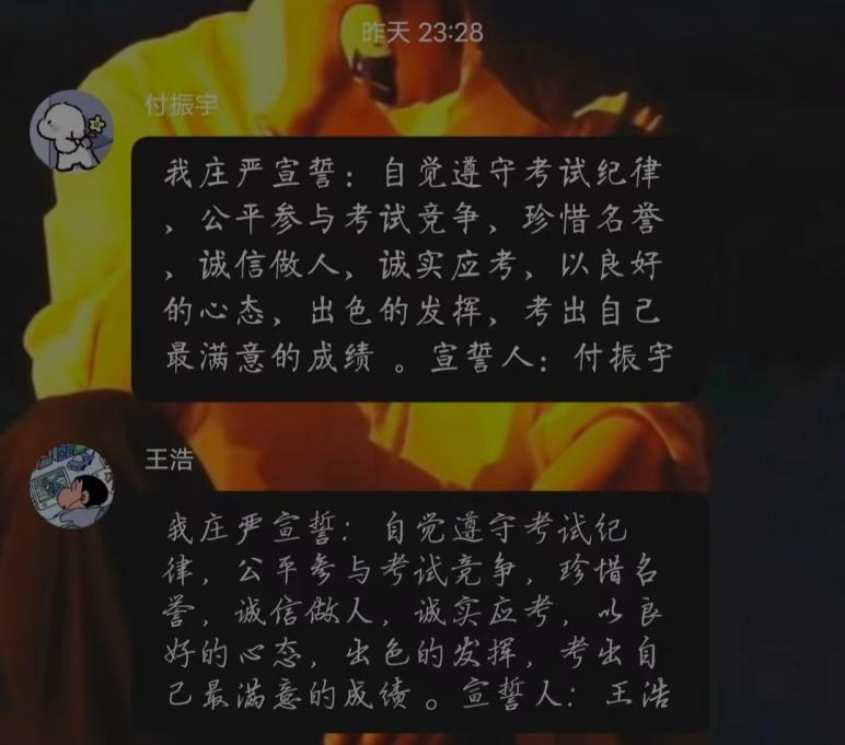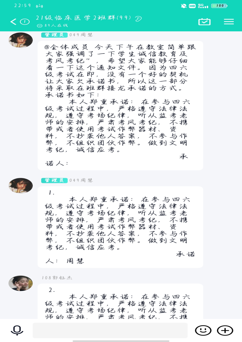 21本二、21本五班在班级群进行宣誓接龙