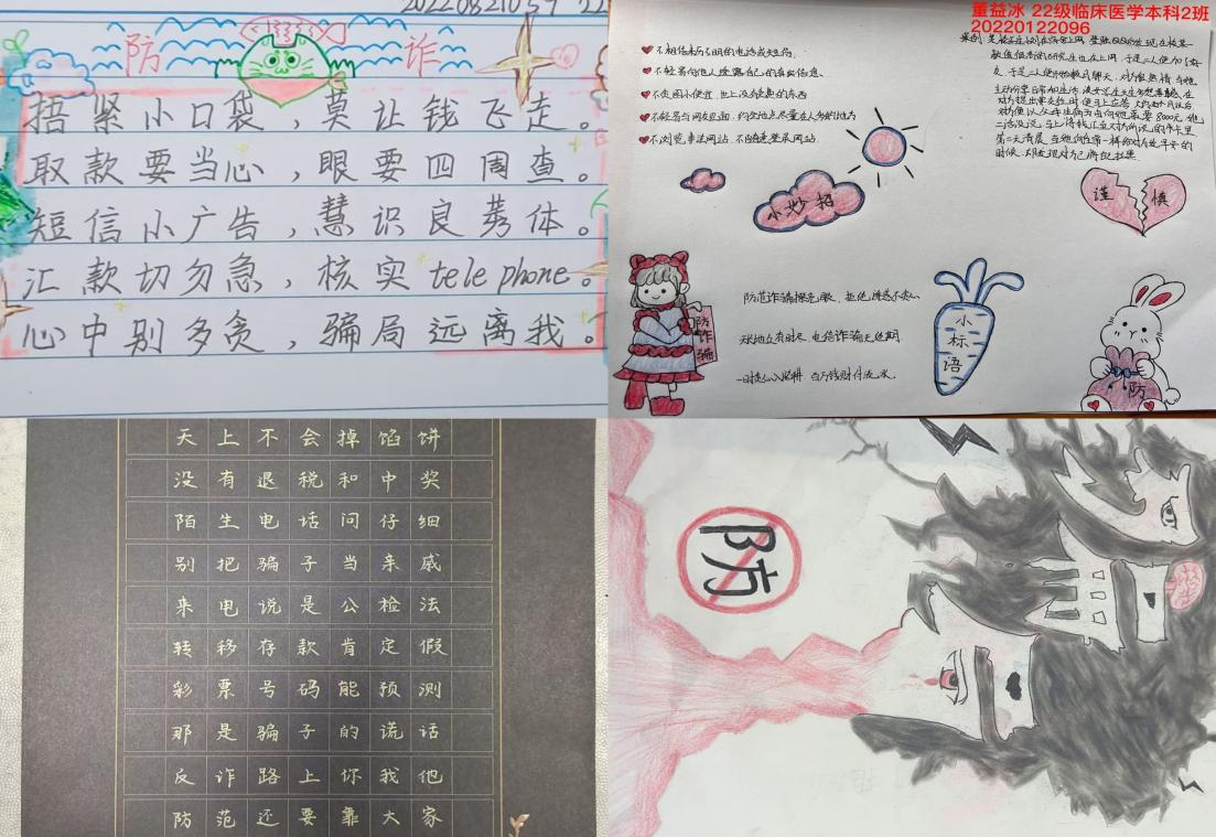 公司组织开展反诈防骗作品征集活动,征集作品包含反诈标语和书画作品。同学们积极参与,作品内容丰富,涵盖多种常见的诈骗手段。通过作品征集的形式提醒广大同学警惕各类诈骗类型,在潜移默化中有效地宣传了校园反诈知识,营造全院共同参与反诈宣传的浓厚氛围。
