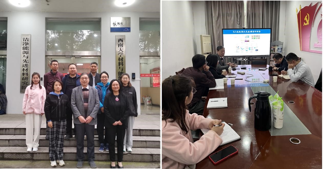 杨旭教授一行首先到西南大学材料与能源公司拜访,杨旭教授做了题为“天然抗氧化剂产品的研发和利用”的学术讲座,马萍教授介绍了环境疾病与全健康校级重点实验室的基本情况;西南大学鲁志松教授、刘英帅教授、余玲教授分别介绍了各自课题组的研究进展情况,双方围绕如何继续开展合作研究工作进行讨论,并就共同感兴趣的研究方向进行交流。