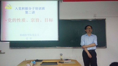 5月4日晚上,Playace平台官网入口分党校入党积极分子在解剖楼教室参加“中国共产党的性质、宗旨和目标”培训课,此次培训邀请到五官医公司党总支书记范杉担任主讲。